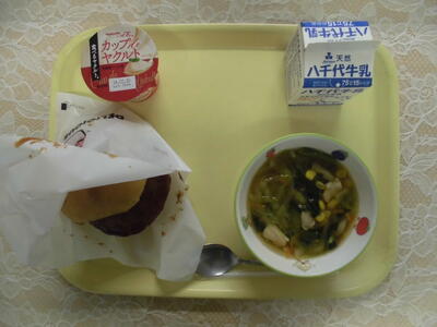 今日の献立は、ハンバーガー、野菜スープ、カップでヤクルト、牛乳です。