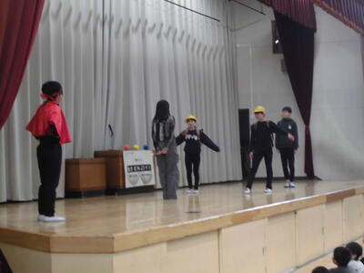 6年生から1~5年生へのメッセージを込めた劇と歌の贈り物がありました。
