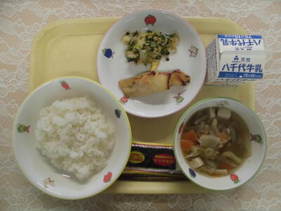 今日の献立は、銀だらの西京焼き、ごま和え、韓国のり、ごはん、吉野汁、牛乳です。