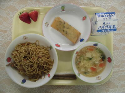 春巻き、やきそば、たまごスープ、イチゴ、牛乳です。