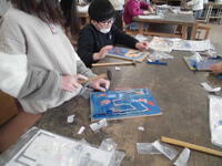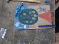 3年生 ビー玉の通り道やビー玉が入る場所を考え、板に釘を打ちます。金槌と釘を使うので緊張しているようでしたが、器用に使いこなして作品を作っています。