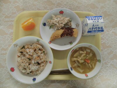 今日の献立は、五目ごはん、鮭の西京焼き、けんちん汁、花みかん、牛乳です。
