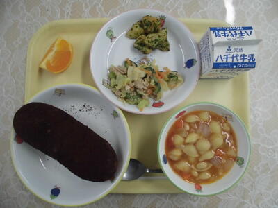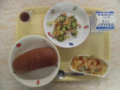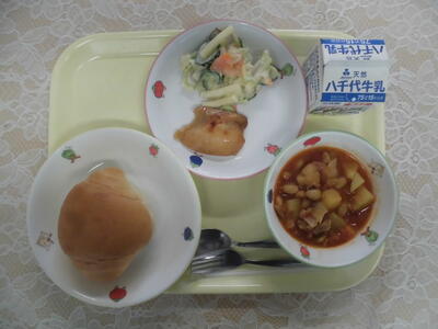 今日の献立は、黒糖パン、鶏肉のはちみつレモン焼き、春きゃべつのチャウダー、青のりポテト、牛乳です。