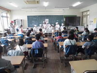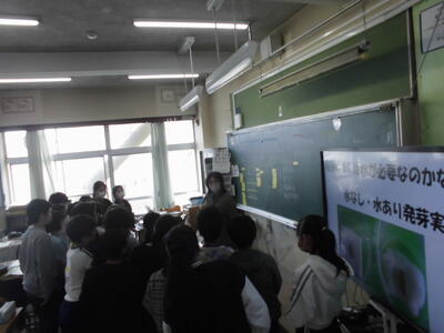 5年生 理科の種子の発芽についての実験に関する注意点を聞いています。みんなとても真剣です。