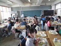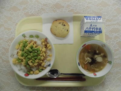 今日の献立は、6年生が家庭科の時間に考えた献立メニューです。6年2組のメニューでタイトルが「残さず食べよう!春をつめこんだ中華飯」になります。