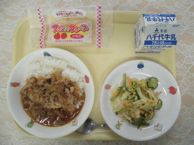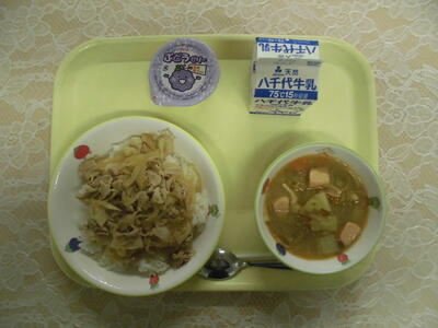 今日の献立は、豚すき丼、石狩汁、ブドウゼリー、牛乳です。
