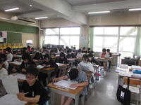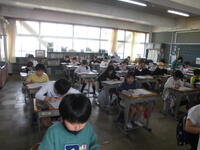 3年生 書写 湿度が高くて集中力が欠けそうな天候ですが、先生の言葉がけのとおり、足の裏を床につけて、姿勢よく丁寧な文字を書いています。