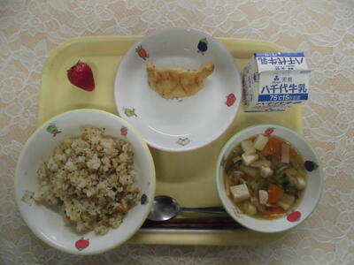 春キャベツチャーハン、鶏のから揚げ、春雨サラダ、中華卵スープ、イチゴ、牛乳です。
