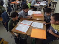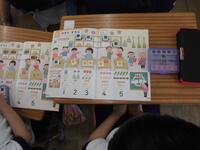1年生 算数の数の学習です。数についての学習と一緒に、様々な道具の扱い方や準備・後片付けなども一緒に学んでいます。先生の話をしっかり聞いる子たちなので、作業もスムーズです。