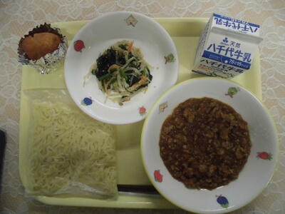 今日の献立は、ジャージャー麺、ナムル、サーターアンダギー、牛乳です。