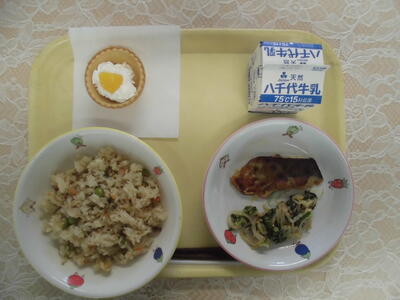 今日の献立は、とりめし、鰆の西京焼き、ごま和え、フルーツタルト、牛乳です。