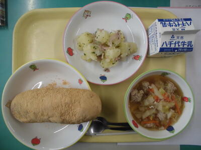 今日の献立は、揚げパン、ジャーマンポテト、肉団子スープ、牛乳です。