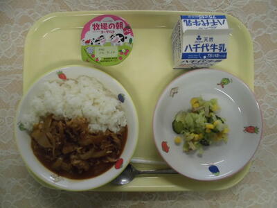 今日の献立は、ハヤシライス、コールスローサラダ、ヨーグルト、牛乳です。