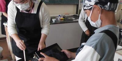 6年生 調理実習で野菜炒めを作っています。作る手順や様子を動画で記録して、学習にいかします。