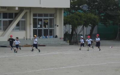 まこも学級 今日は、全学年合同体育です。先生のスタートの合図をよく聞き、座っている姿勢から立ち上がりゴールを目指します。応援しあう姿も見られ、楽しく学習しています。