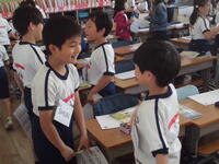 そして、5つある絵について発表しようとしています。みんな、手がしっかりあがっています。指名されたら、「はい」と返事を、椅子をしまってみんなに聞こえる声の大きさで発表です。聞いてるみんなは、発表者の方に体を向けて聞く姿勢をとります。素晴らしい態度でした。