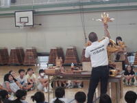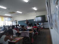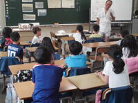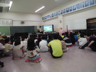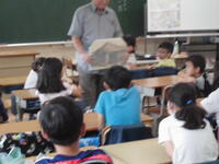 3,4時間目に、シャボン玉教室を実施しました。シャボン玉の先生が、お手本として作ったシャボン玉の大きさや形などに興奮気味の子供たち、コツを教えていただき、一生懸命大きなシャボン玉を作っていました。