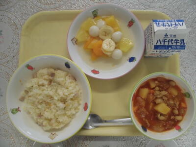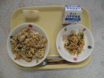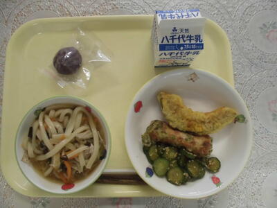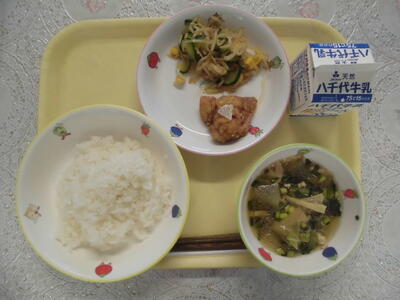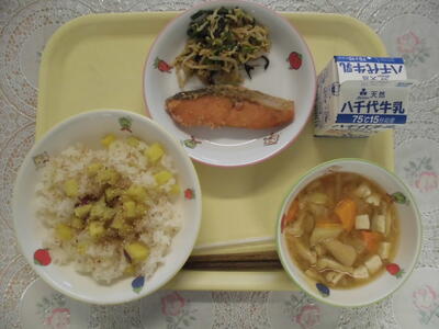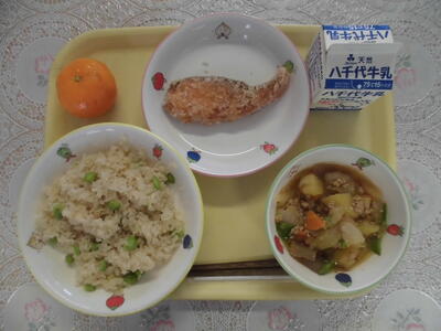 今日の献立は、枝豆ご飯、鮭の竜田揚げ、じゃがいもの含め煮、冷凍みかん、牛乳です。