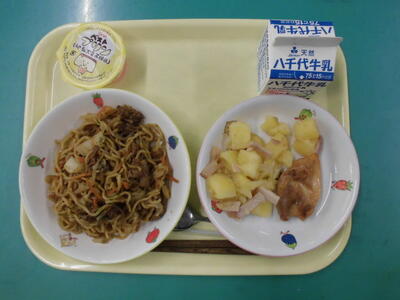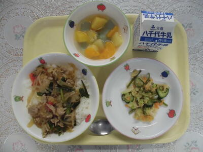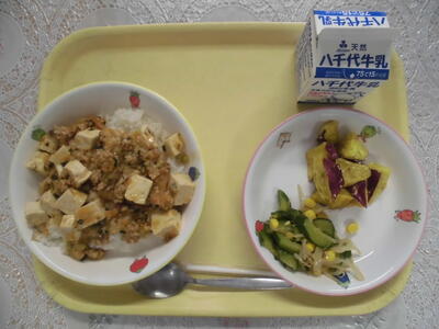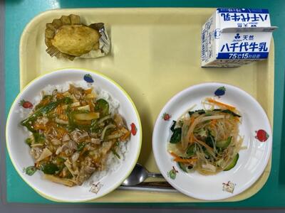 今日の献立は、チンジャオロース丼、春雨サラダ、スウィートポテト、牛乳です。