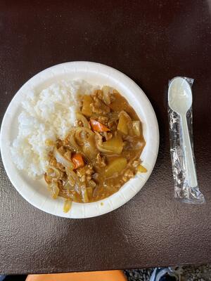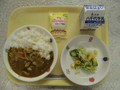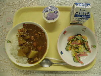 今日の献立は、ポークカレー、ごはん、サラミのサラダ、ぶどうゼリー、牛乳です。