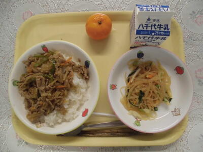 今日の献立は、プルコギどん、はるさめサラダ、冷凍みかん、牛乳です。
