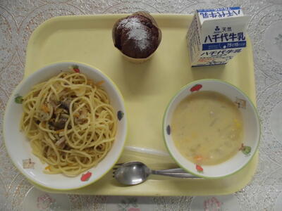 今日の献立は、あさりのスパゲティ、米粉豆乳コーンシチュー、チョコマフィン、牛乳です。