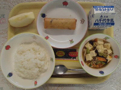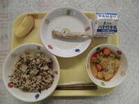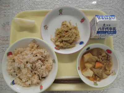 今日の献立は、ひじきごはん、ししゃものから揚げ、肉じゃが、りんご、牛乳です。
