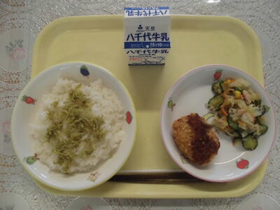 今日の献立は、コロッケ、ツナサラダ、カレーふりかけ、ごはん、牛乳です。