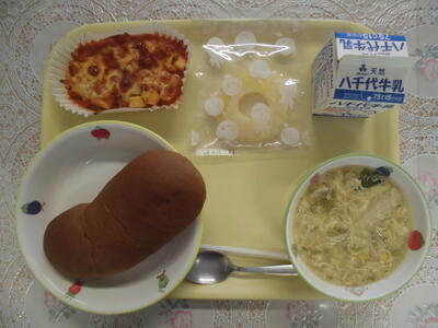 9月13日 黒糖パン、豆腐グラタン、レタスとたまごスープ、冷凍パイン、牛乳でした。