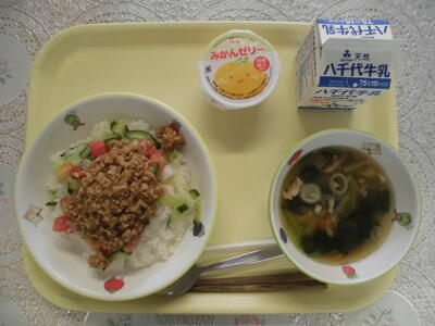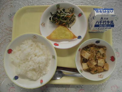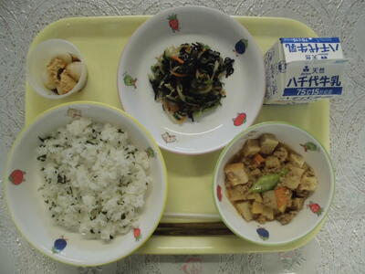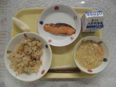今日の献立は、さけわかめご飯、生揚げの肉味噌煮、胡麻和え、なし(豊水)、牛乳です。