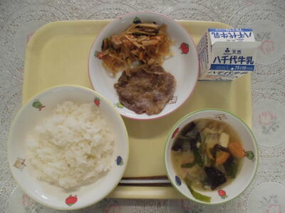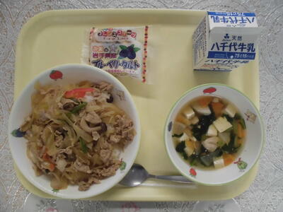 今日の献立は、生姜焼き丼、吉野汁、ブルーベリータルト、牛乳です。