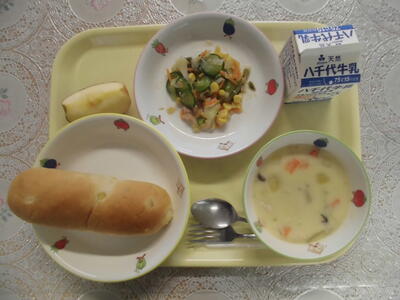 今日の献立は、さつまいもパン、秋のクリームシチュー、ツナサラダ、リンゴ、牛乳です。
