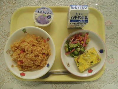 今日の献立は、チキンピラフ、スペイン風オムレツ、サラミサラダ、ぶどうゼリー、牛乳です。