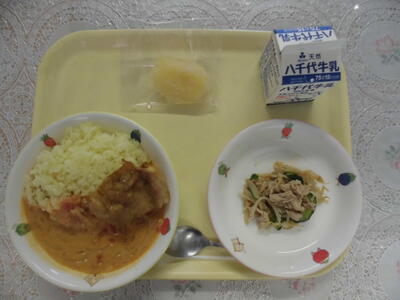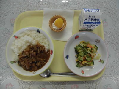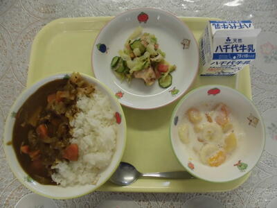 献立は、ポークカレー、イタリアンサラダ、フルーツヨーグルト、牛乳です。