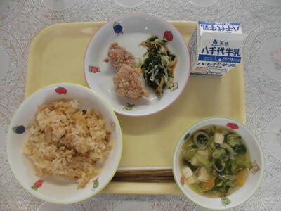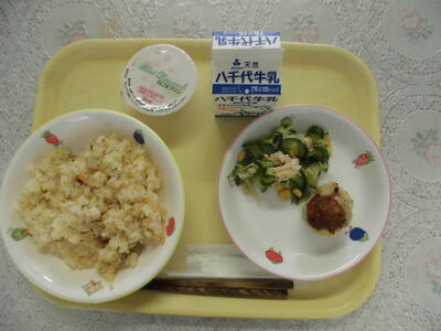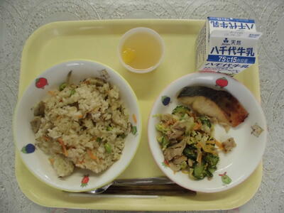 今日の献立は、とりめし、さわらの西京焼、焼肉サラダ、もものゼリー、牛乳です。