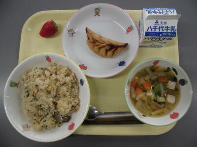今日の献立は、青梗菜チャーハン、揚げぎょうざ、春雨スープ、イチゴ、牛乳でした。