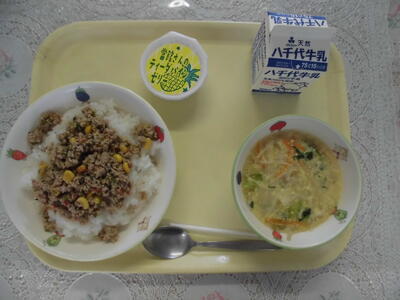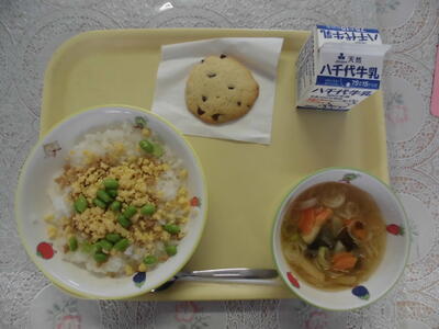 今日の献立は、三色そぼろごはん、みそしる、がまくんのクッキー、牛乳です。