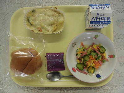 今日の献立は、テーブルロール、ブルーベリージャム、バムとケロのグラタン、サラミサラダ、牛乳です。