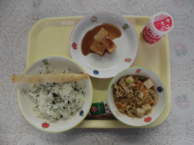 今日の献立は、わかめご飯、えんぴつの天ぷら、肉豆腐、わらび餅、ジョア(ストロベリー)