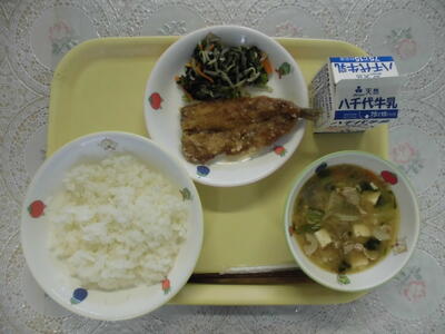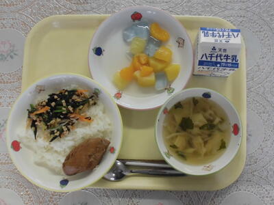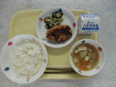 今日の献立は、鮭わかめごはん、肉じゃが、イカのかりん揚げ、美生柑(みしょうかん)、牛乳です。