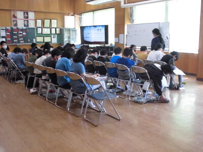 2,4,6年生が体育館、その他の学年、学級がオンラインで参加する、ハイブリッド型の朝会を実施しました。