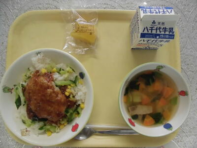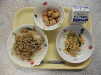 今日の献立は、豚の生姜焼き丼、吉野汁、お麩のきな粉ラスク、牛乳です。