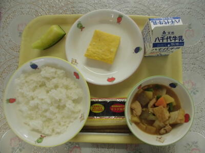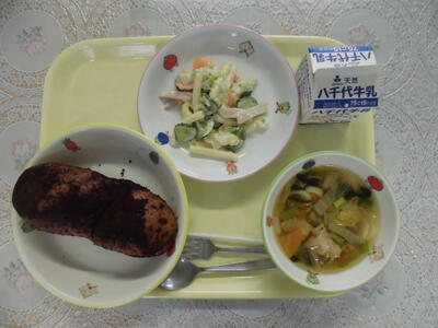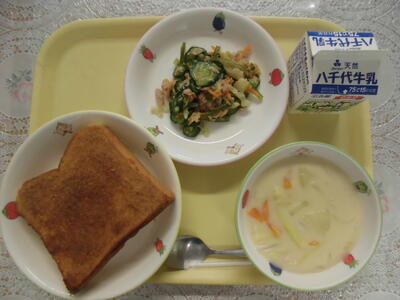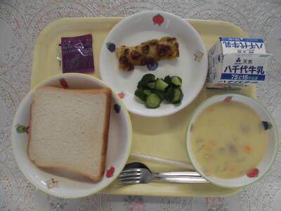 今日の献立は、食パン、ブルーベリージャム、竹輪カレー揚げ、フレンチきゅうり、米粉豆乳コーンシチュー、牛乳です。