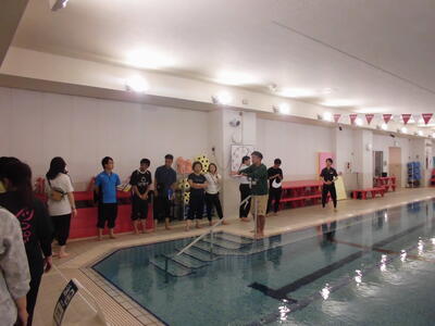 6年生は、プールサイドに行く前に、室内での動きや準備体操の隊形等について説明を受けました。