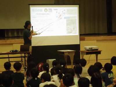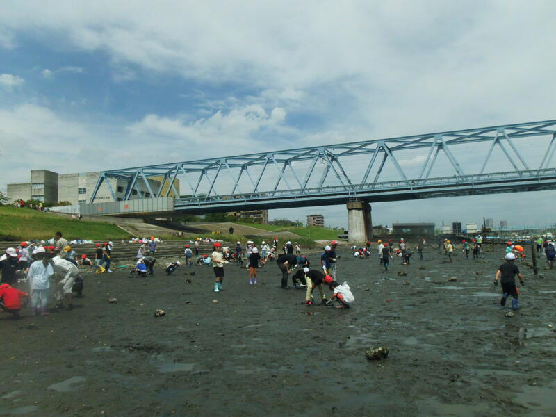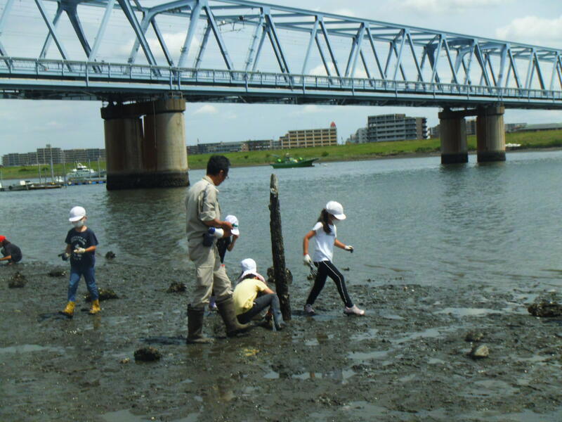 自然博物館の学芸員さんを講師にお迎えして、妙典小の脇の干潟の観察をしました。