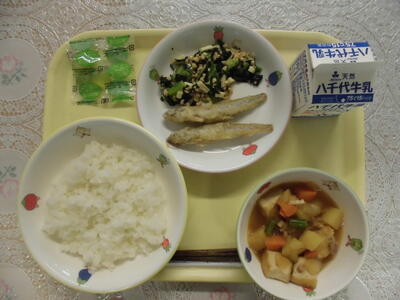 今日の献立は、ごはん、わかさぎのから揚げ、厚揚げと野菜のうま煮、チーズ納豆、かみかみグミ、牛乳でした。