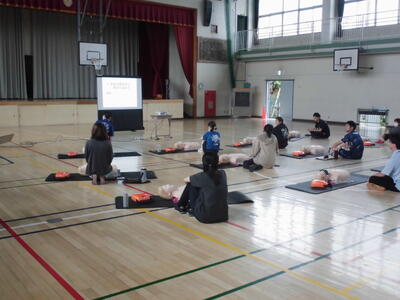事前の動画講習と確認テスト合格後に、胸骨圧迫やAEDの使用方法等の訓練を行いました。