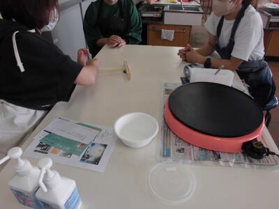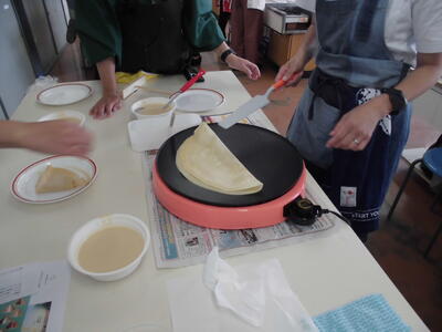 きれいなクレープにするために、テーブルの上で生地を広げる猛特訓を受けてから、クレープづくりをしました。