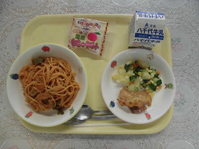 今日の献立は、スパゲティナポリタン、鶏肉のマーマレード焼き、マセドアンサラダ、お米で桃タルト、牛乳でした。