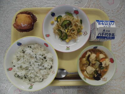 6月23日(金) 中華五目豆腐、もやしのサラダ、わかめご飯、オレンジおからドーナツ牛乳 です。